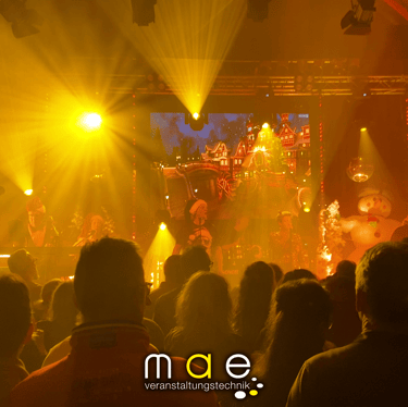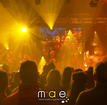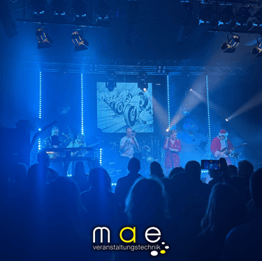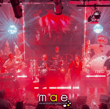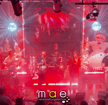 Doch nicht nur die Auswahl aus bekannten Songs aus den 80ern und Weihnachtsliedern sorgte in diesem Jahr erneut für Begeisterung. Auch das von uns gestellte und bediente Lichtequipment sorgte für die passende Stimmung. Ergänzt von passenden Bildern auf einer 6qm², die die Band lieferte und von uns eingespielt wurden, und beschneiten Bäumen sowie einem großen Schneemann, ist es so gelungen ein stimmiges Bühnenbild zu schaffen, welches viele Besucherinnen und Besucher faszinierte. Zusätzlich sorgten wir am letzten der drei Termine für den passenden Sound.